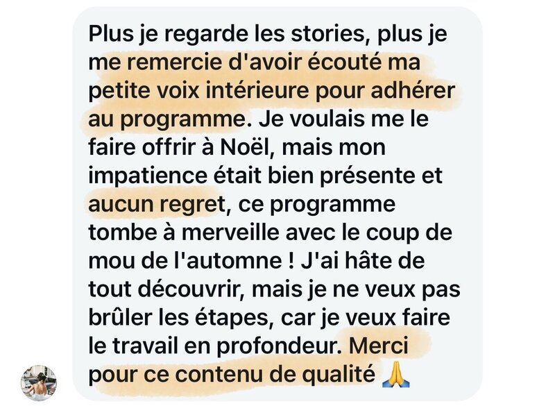Aucune pression, aucun rythme imposé. Tu avances à ton propre tempo, selon ton énergie, avec un accès illimité à tous les modules pour y revenir chaque fois que ton cœur t’y appelle.